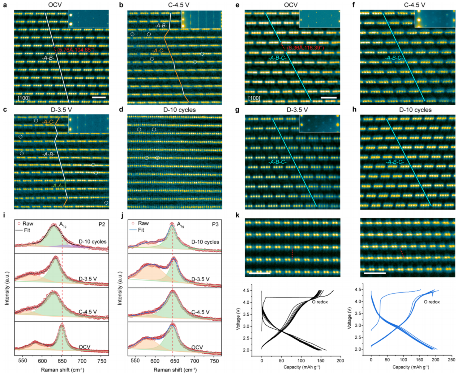 图1 P2-R-NMO与P3-R-NMO正极材料的层间超结构差异及原子尺度结构表征
