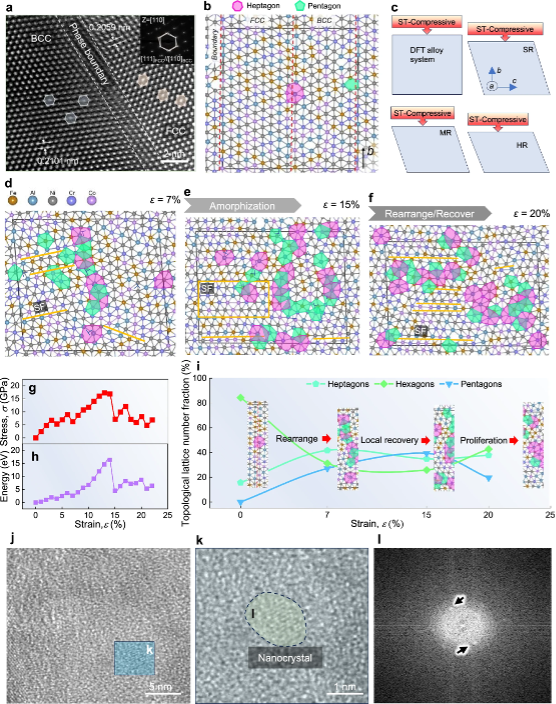 论文阐述了合金微柱中利用超域非晶化机制取代剪切带。通过施加跨多个应变速率的连续压缩(称为应变训练),非晶化范围突破了传统的纳米尺度限制,达到了前所未有的~1.34 μm,相当于变形微柱高度的三分之一。传统非晶或玻璃态合金通常通过快速淬火或合金化抑制结晶的方法制备。相比之下,我们提出的应变训练策略通过机械加载直接在晶体合金中诱导非晶化,从而绕过了热加工的限制。这种方法与其他非热非晶化途径(如离子辐照、熔融淬火过程或单辊熔融纺丝)截然不同。双球差校正透射电子显微镜和密度泛函理论计算表明,自上而下的位错梯度介导了拓扑晶格缺陷积累,引发长程原子重排和纳米晶体恢复,耗散高达~6 GPa的剪切应力。与传统合金损伤容限认知不同,高应变速率下得到的强度不再是上限,超域非晶化使合金极限抗压强度和延展性几乎是其两倍。