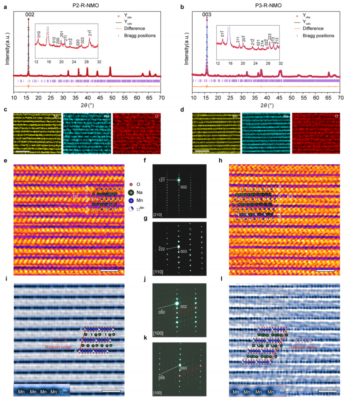 图1 P2-R-NMO与P3-R-NMO正极材料的层间超结构差异及原子尺度结构表征