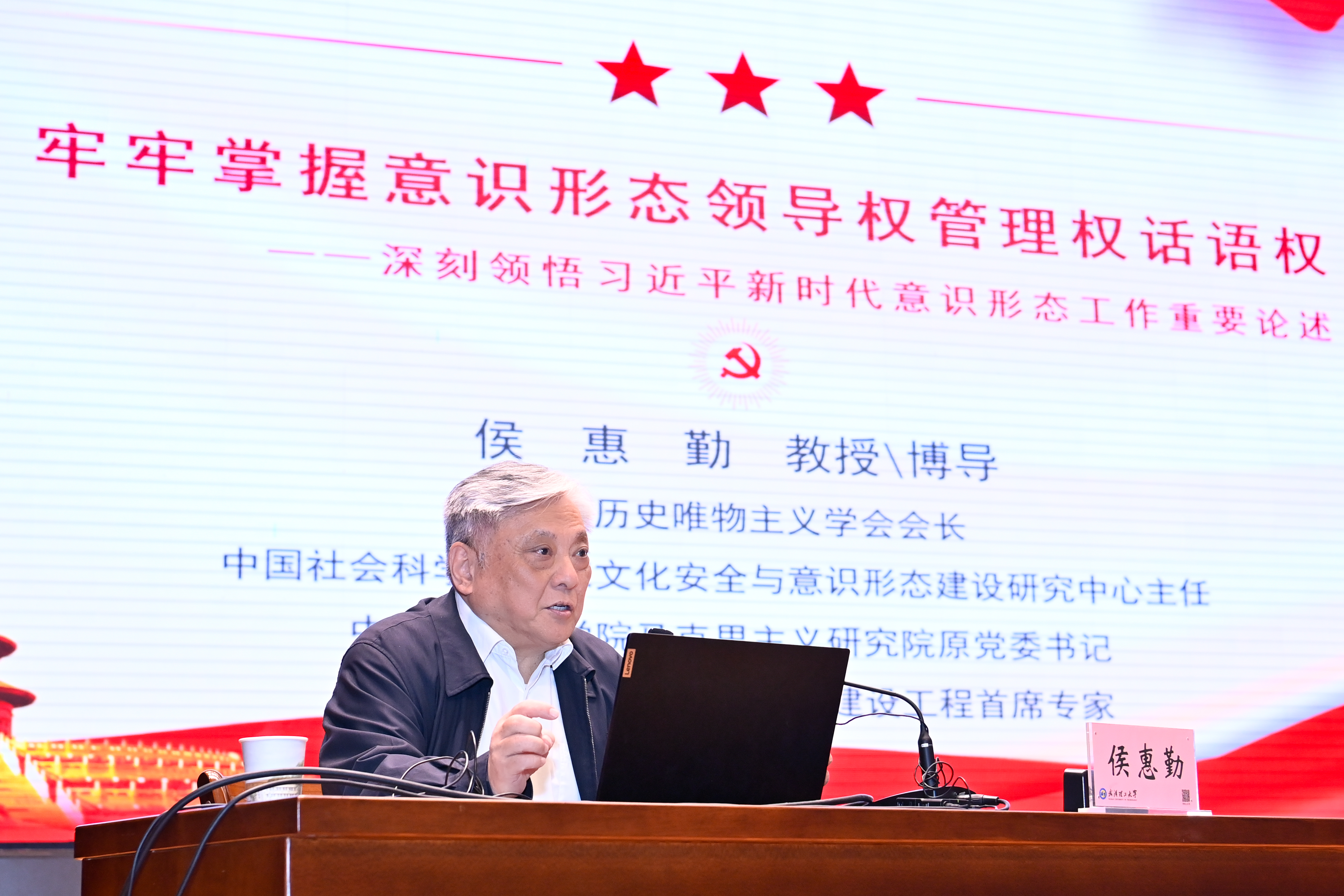 侯惠勤教授结合习近平总书记关于意识形态工作的重要论述,系统梳理了党的十八大以来我国意识形态领域取得的历史性变革,从性质定位、责任定位、任务定位三个角度阐释了意识形态工作的科学定位,就如何做好意识形态重大风险防控进行了深入阐述,并结合实际案例阐明如何检验理想信念是否坚定,强调要始终把坚定共产主义理想和中国特色社会主义信念作为意识形态工作的落脚点。