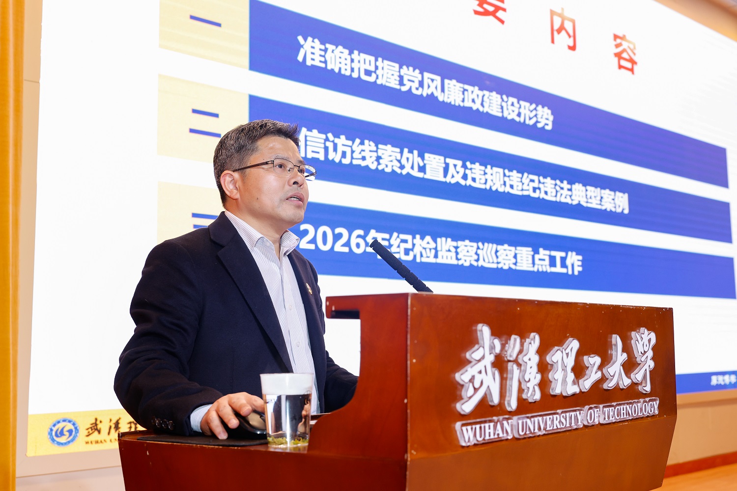 校党委书记孟芳兵作题为《对照更高标准 落细更实举措 以全面从严治党实绩实效推动“十五五”良好开局》的讲话。他指出,要提高政治站位,深刻把握新时期高校全面从严治党的新使命新要求,深入学习贯彻习近平总书记在二十届中央纪委五次全会上的重要讲话和全会精神,认真领会落实2026年教育系统全面从严治党工作视频会议和湖北省有关会议部署要求,深刻理解把握纵深推进全面从严治党是学校坚持“3年攻坚、5年突破、10年谋远”和创新融合战略路径的必然要求。2025年,学校站在收官“十四五”、谋划“十五五”的关键节点上,牢牢把握教育的“三大属性”,坚持用改革精神和严的标准管党治党,坚持政治建设提质增效,组织建设精准发力,纪律建设从严从实,作风建设常态长效,守牢安全稳定底线,压实压紧各类责任,为“十四五”圆满收官和“三年行动计划”起势见效提供了坚强保障。对照党中央、教育部党组和湖北省委的新要求,对标当前教育领域全面从严治党面临的新形势,对表师生群众和社会各界对学校的新期待,工作中还存在警示教育震慑作用不够,制度体系建设仍不到位,学生教育管理服务领域问题较为突出,作风建设方面仍有弱项,追责问责存在较大差距等薄弱环节。