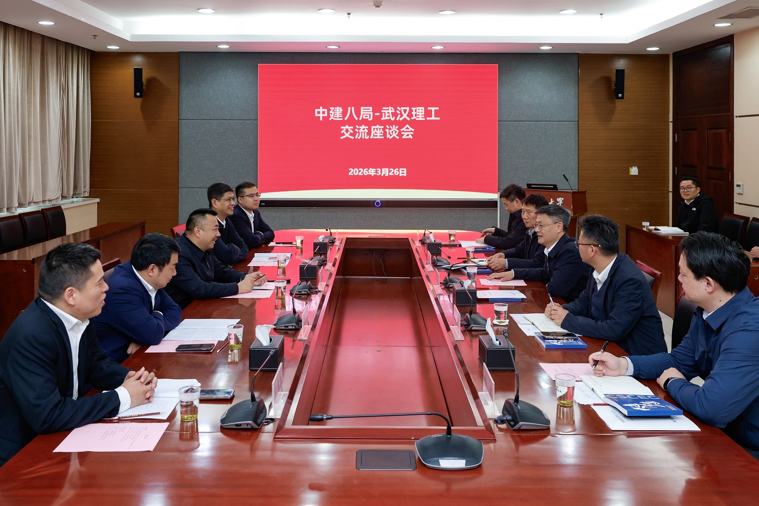 座谈会在会议中心103举行。中建八局华中分局市场部、二公司、二公司湖北公司,学校基建处、后管处、土建学院、硅酸盐中心负责人参加座谈。