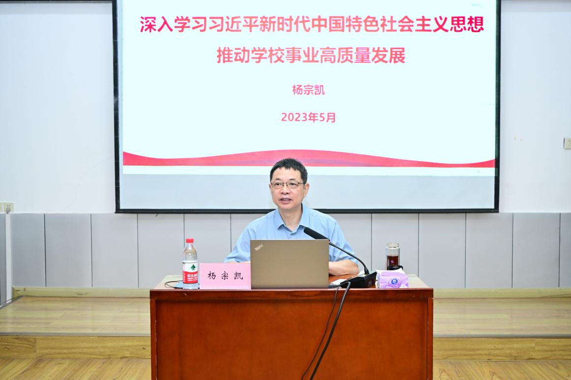 杨宗凯校长以《深入学习习近平新时代中国特色社会主义思想推动学校事业高质量发展》为题,为船海能动学院仿真中心与高性能舰船党支部、船海本科生一支部师生讲授了一堂生动深入的专题党课。杨宗凯校长从学习贯彻习近平新时代中国特色社会主义思想的重大意义出发,对适应国情的时代意义、融合传统的文化意义和回答世界的发展意义进行了细致阐述;对习近平新时代中国特色社会主义思想的科学体系与核心要义进行了深入梳理;对“十个明确”、“十四个坚持”、“十三个方面成就”和“六个必须坚持”进行了系统性阐释;围绕高质量开展主题教育,把主题教育成效转化为工作实效,对船海能动学院数字化转型提出了新的要求。最后,杨宗凯校长从坚定理想信念、厚植爱国情怀、练就过硬本领、践行使命担当、激扬青春力量五个方面鼓励在座的青年师生成为堪当民族复兴重任的时代新人。他希望,每一位理工青年都能拥抱新时代、奋进新时代,以习近平新时代中国特色社会主义思想凝心铸魂,以“厚德博学、追求卓越”的大学精神为引领,用实际行动展现理工学子的奉献担当,让青春在民族复兴伟大进程中焕发绚丽的光彩。