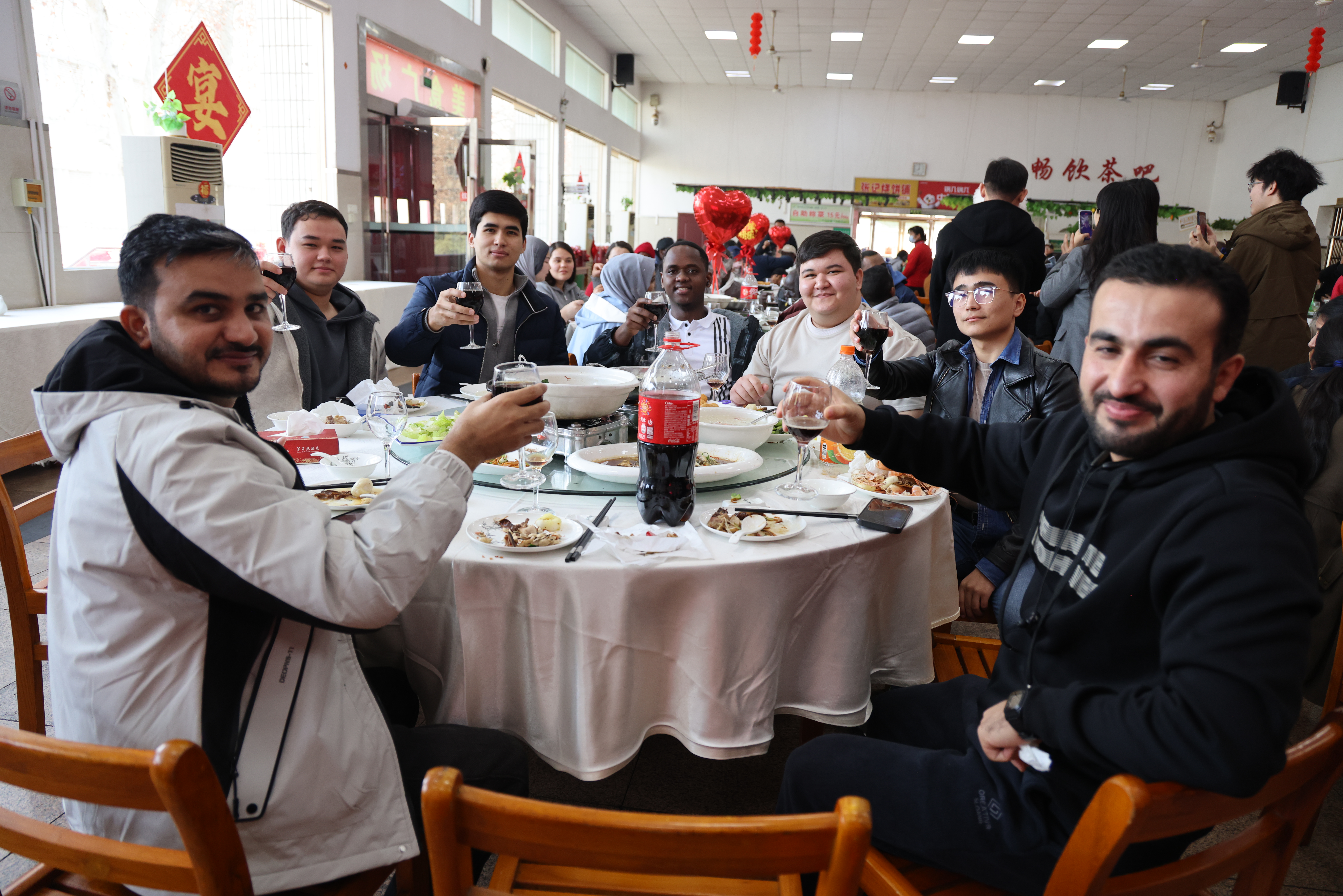 新闻网讯 2月12日,学校“风行国际”文化节系列活动之“四海一家 共暖此冬”国际学生新春团年宴在莘子苑餐厅温情启幕。副校长张笛,武汉市出入境管理局、马房山派出所相关领导,学校本科生院、研究生院、国际处、国际教育学院负责人及留学生管理人员,与近 200 名留校国际学生欢聚一堂,共迎新春佳节。