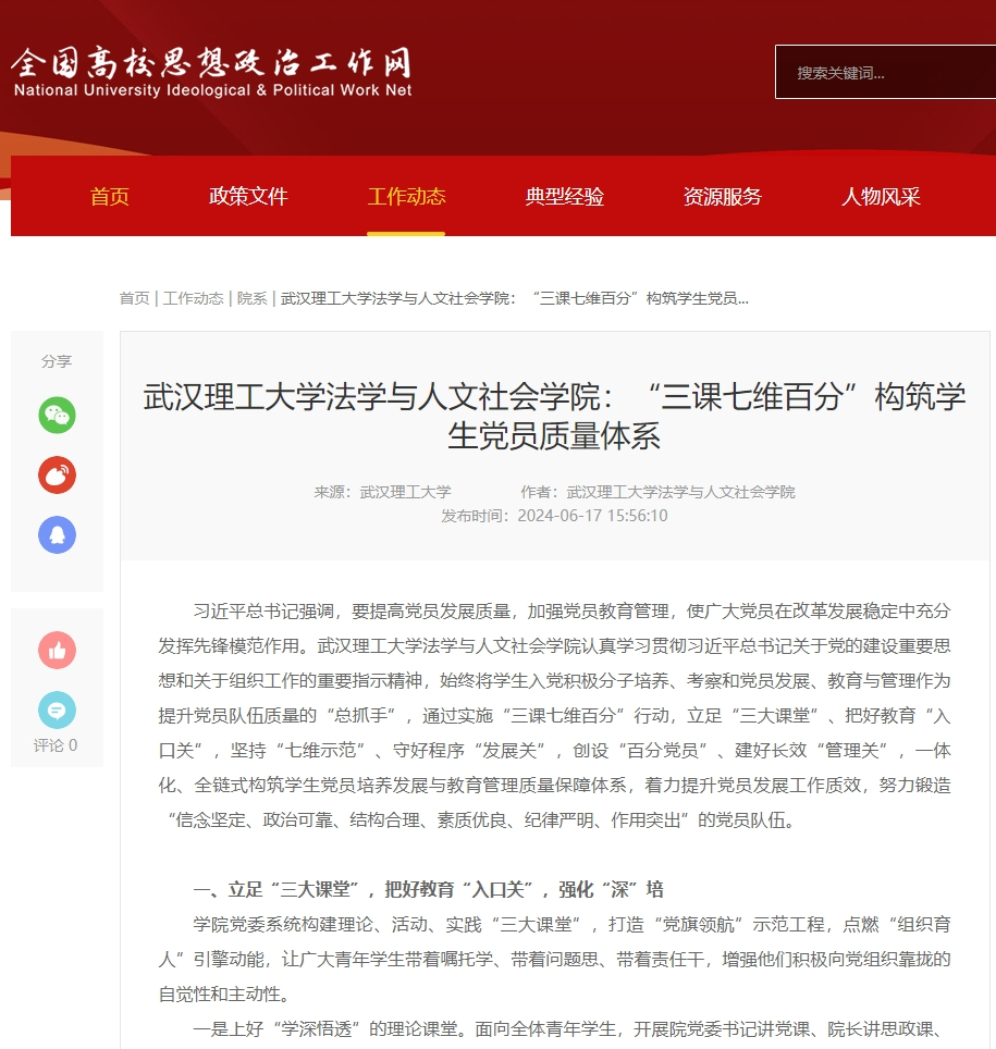 新闻网讯 6月17日,全国高校思想政治工作网以《武汉理工大学法学与人文社会学院:“三课七维百分”构筑学生党员质量体系》为题,报道推介我校法学与人文社会学院认真学习贯彻习近平总书记关于党的建设重要思想和关于组织工作的重要指示精神,始终将学生入党积极分子培养、考察和党员发展、教育与管理作为提升党员队伍质量的“总抓手”,通过实施“三课七维百分”行动,立足“三大课堂”、把好教育“入口关”,坚持“七维示范”、守好程序“发展关”,创设“百分党员”、建好长效“管理关”,一体化、全链式构筑学生党员培养发展与教育管理质量保障体系,着力提升党员发展工作质效,努力锻造“信念坚定、政治可靠、结构合理、素质优良、纪律严明、作用突出”的党员队伍。全文如下。