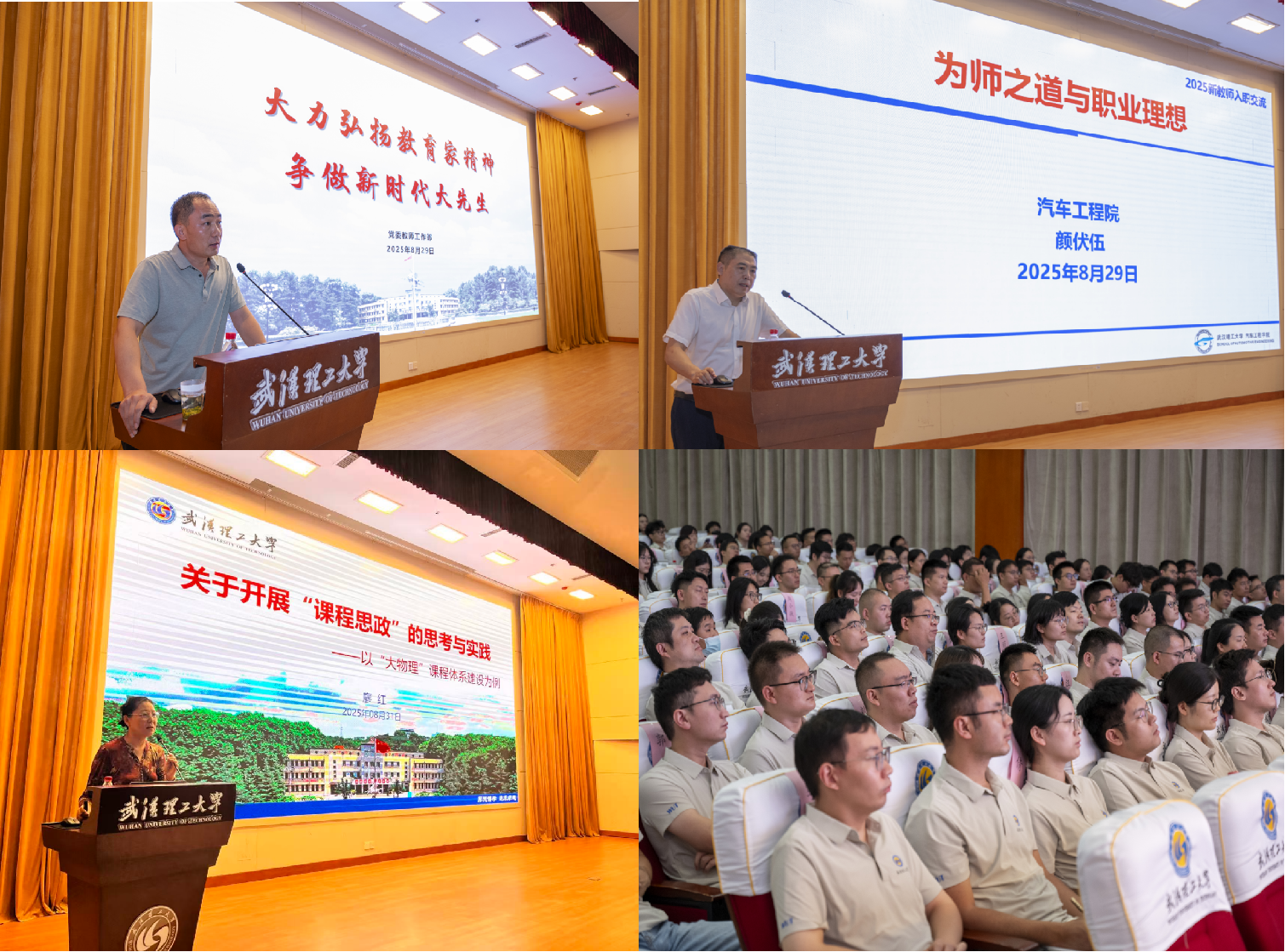 学校人事处处长、党委教师工作部部长郭永琪以“大力弘扬教育家精神,争做新时代大先生”为题开展师德师风专题教育,为新教师锚定精神坐标。湖北省教学名师、汽车学院院长颜伏伍教授作“为师之道与职业理想”专题报告,分享其长期深耕教学科研一线的成长历程与育人经验。湖北省“荆楚好老师”、湖北省师德先进个人、物理与力学学院廖红教授结合数十年从教经验,分享她对“课程思政”的思考与实践。