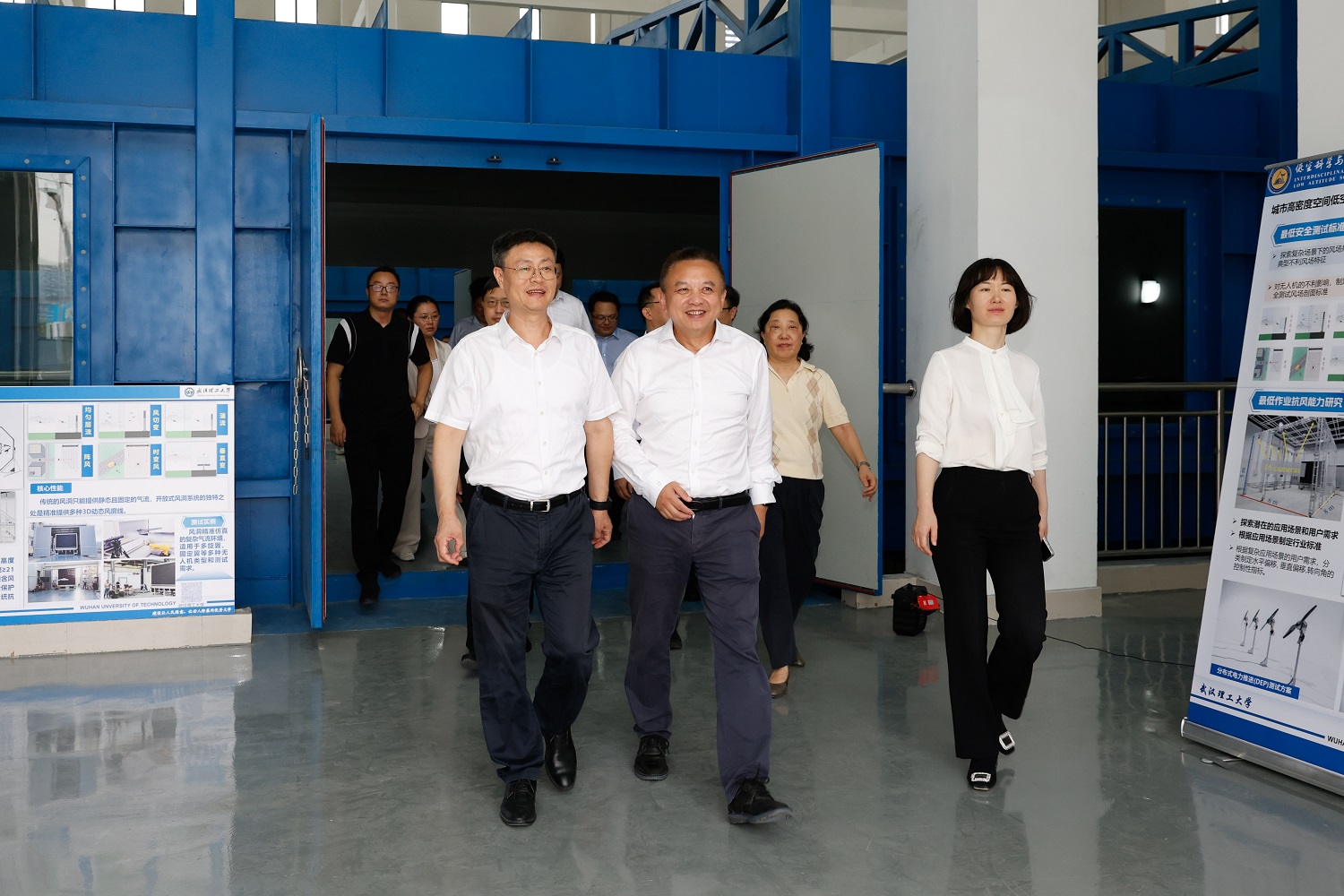 孟晖一行实地考察了学校风洞实验室,详细了解了风洞实验平台的技术性能、运行情况及产业服务能力等。