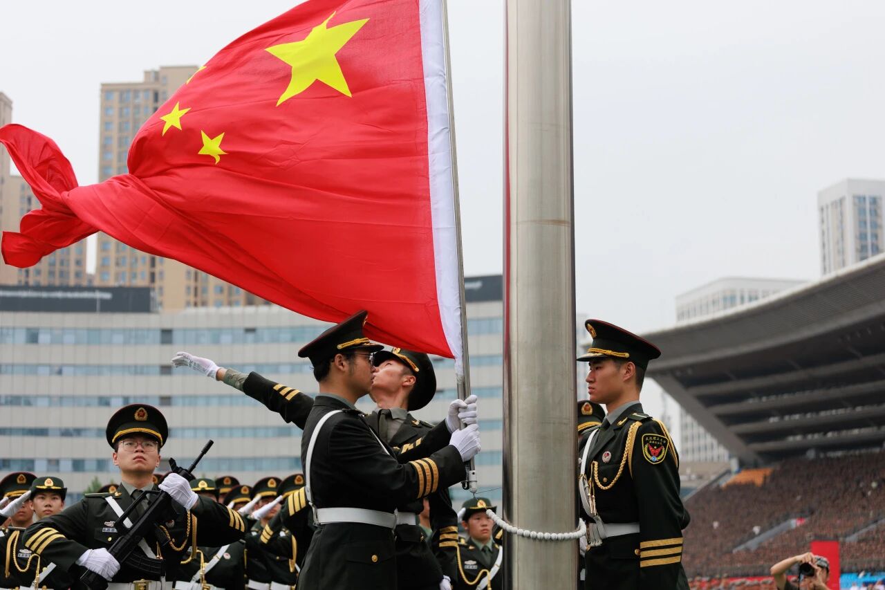 大会在庄严的国歌声中拉开帷幕,国旗队队员步伐铿锵,护卫国旗冉冉升起。