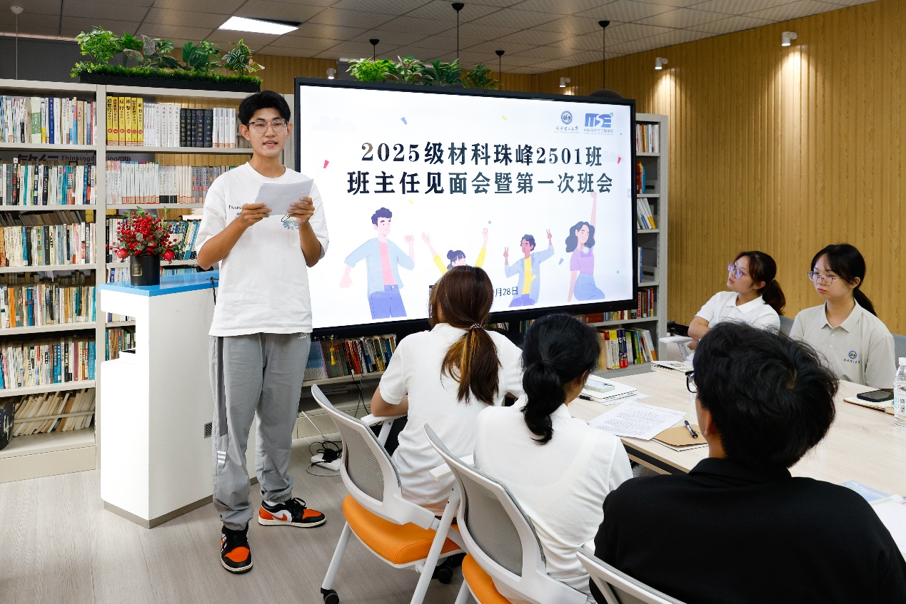新闻网讯 9月28日下午,材科珠峰2501班班会在南湖校区敏行辅导员工作室举行,校长、材科珠峰2501班班主任王发洲以“‘三心’育‘三力’,培育创新复合型人才”为主题,为材科珠峰2501班学生讲授开学第一课。