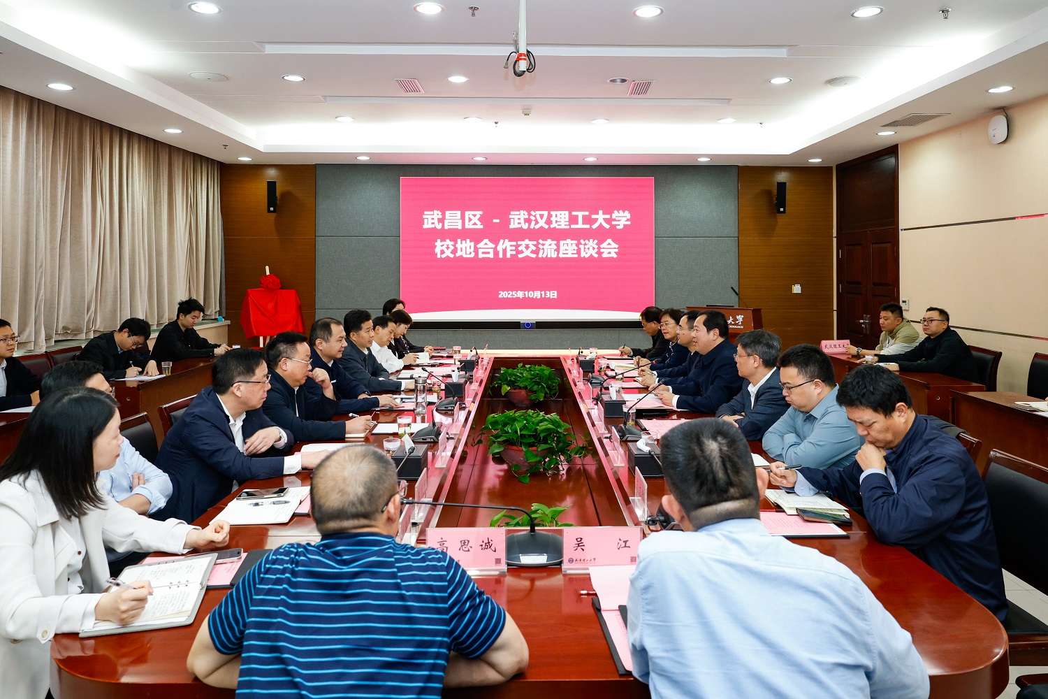 新闻网讯 10月13日下午,武昌区委书记余松、区长范礼奎一行来校调研,双方围绕进一步推进校地合作进行座谈交流。武昌区委常委、常务副区长徐涛,区委常委、组织部部长施国宏,区委常委、区委办公室主任李远华,副区长陈露露;校党委书记孟芳兵、校长王发洲、校长助理胡剑出席座谈会。