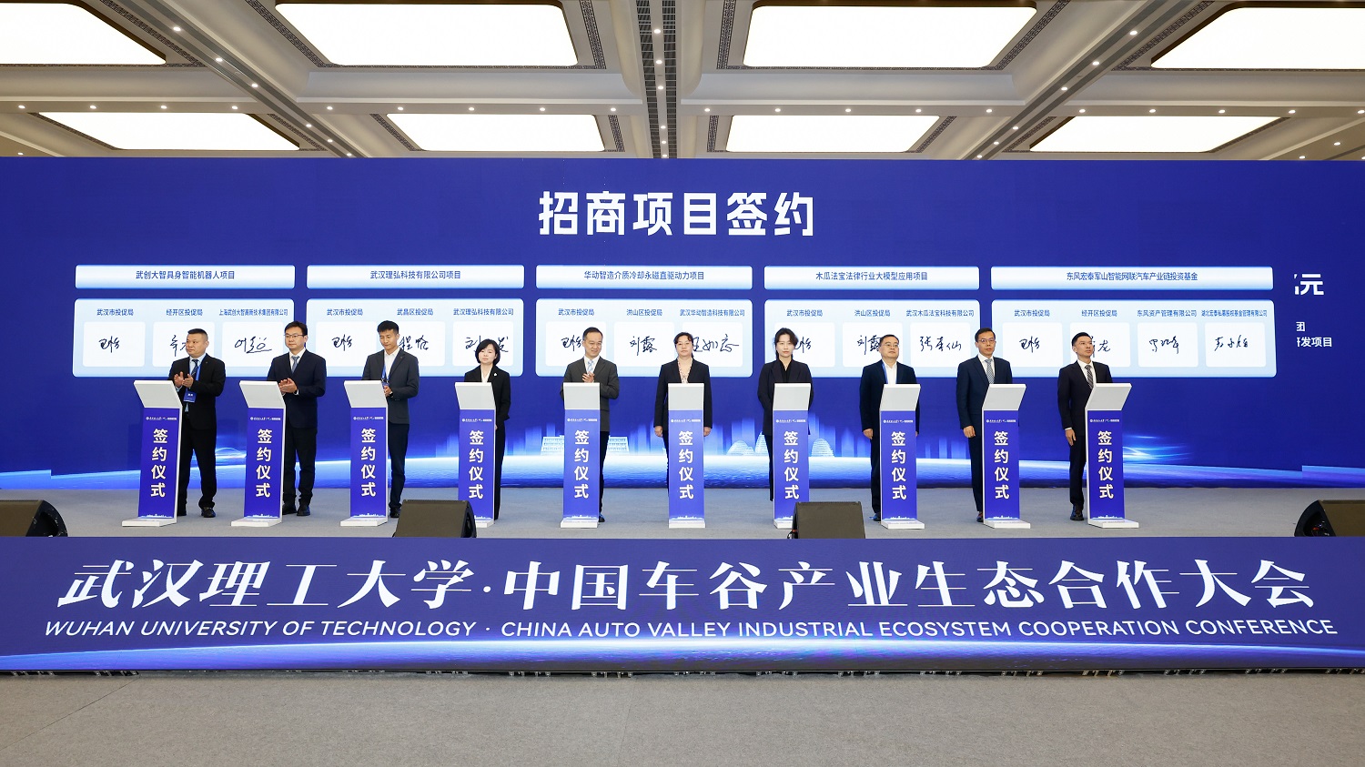 大会现场共签订30个重点项目。武汉理工大学分别与武汉经开区、广西汽车集团、比亚迪、北京理想汽车、中国移动湖北公司等签订校地、校企战略合作协议。现场签订科研项目14个,签约金额9.42亿元,招商项目11个,签约金额51.57亿元。校地、校企、招商项目签约合计60.99亿。