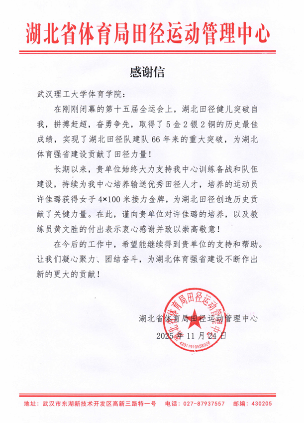 11月24日,湖北省体育局田径运动管理中心给我校发来感谢信,感谢我校对湖北省田径项目的支持与保障。信中表示,湖北田径队取得的优异成绩,离不开武汉理工大学对田径项目长期的支持与保障,在此,向武汉理工大学对许佳璐等同学的培养和教练员黄文胜的付出表示衷心感谢并致以崇高敬意,希望能继续加强与武汉理工大学的合作,凝心聚力、团结奋斗,为湖北体育强省建设不断作出新的更大的贡献!