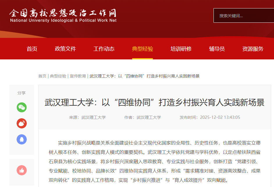 新闻网讯 12月2日,全国高校思想政治工作网以《武汉理工大学:以“四维协同”打造乡村振兴育人实践新场景》为题,报道推介我校以定点帮扶陕西省石泉县为核心实践场景,将乡村振兴深度融入思政教育、专业实践与社会服务,创新打造“党建引领、专业赋能、校地协同、品牌长效”四维协同实践育人体系。全文如下。