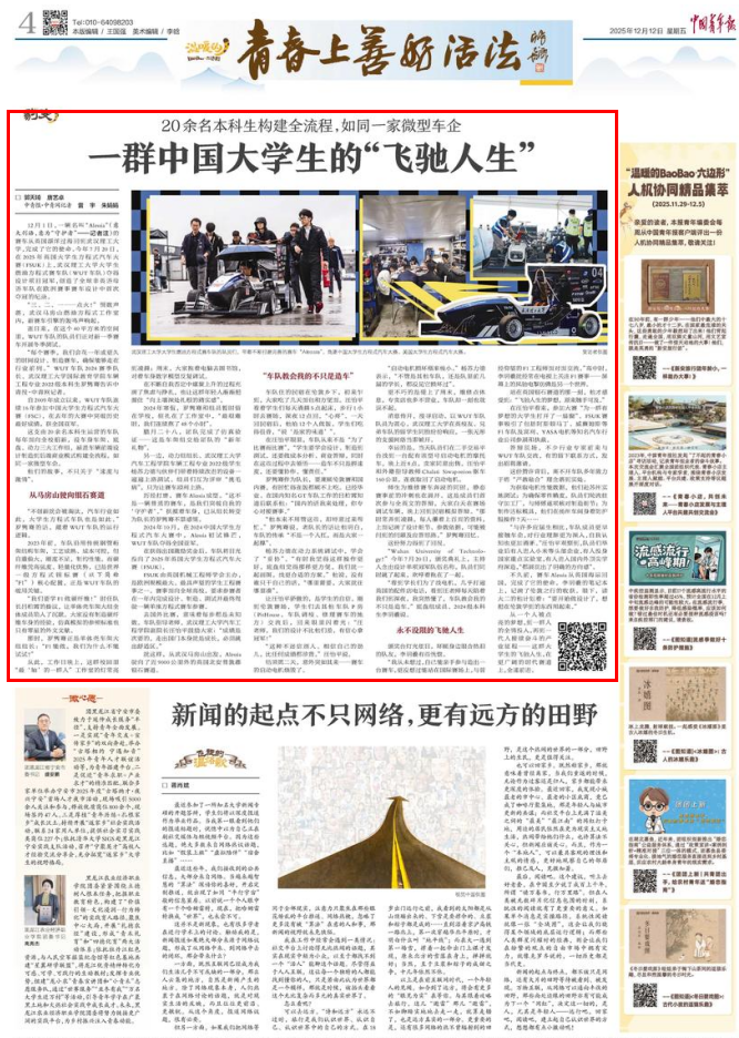 新闻网讯 12月12日,中国青年报以《一群中国大学生的“飞驰人生”》为题报道我校大学生燃油方程式赛车队(WUT车队)夺得2025年英国大学生方程式汽车大赛(FSUK)设计项目冠军,创造了全球非英语母语车队在欧洲赛事赛车设计中首次夺冠纪录的故事。全文如下。