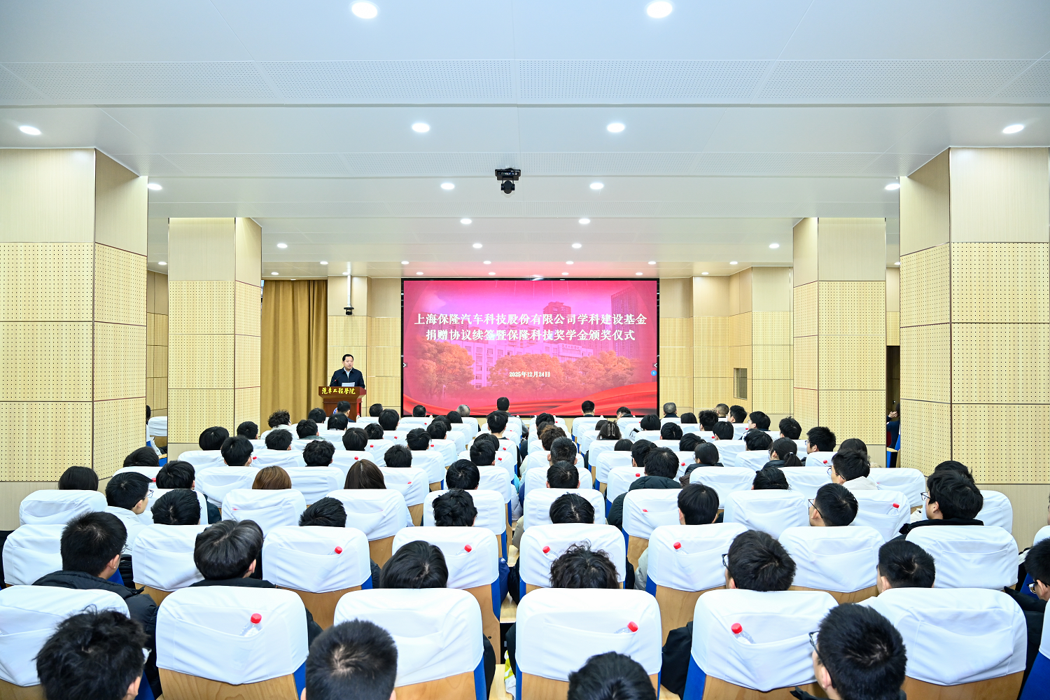 新闻网讯 12月24日,上海保隆汽车科技股份有限公司与学校学科建设基金捐赠协议续签仪式在汽车学院保隆科技报告厅举行。上海保隆汽车科技股份有限公司名誉主席陈洪凌校友,学校党委书记孟芳兵、副校长胡剑出席,相关职能部门、汽车学院负责人与师生代表参加会议。