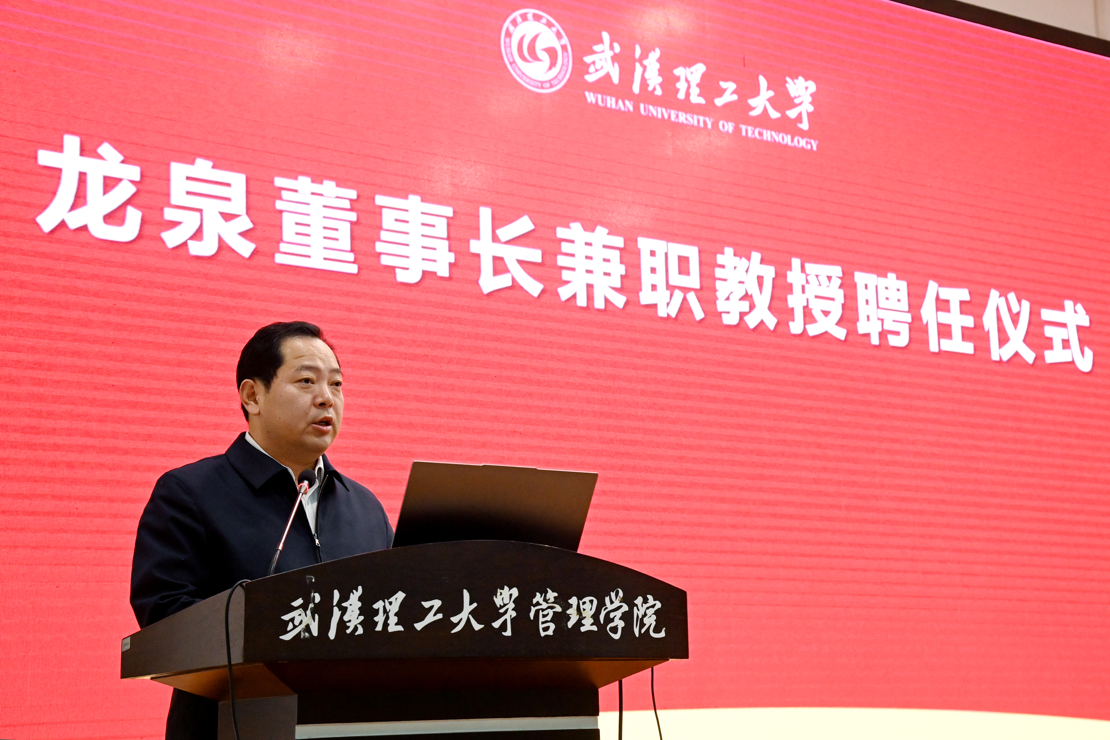 新闻网讯 12月28日上午,龙泉校友兼职教授聘任仪式暨创新管理论坛专题讲座在学校管理学院举行。校党委书记孟芳兵、校党委副书记李潮欣出席活动,中国平安财产保险股份有限公司党委书记、董事长兼首席执行官龙泉,中国平安财产保险股份有限公司湖北分公司党委书记、总经理王文进等受邀参加,师生代表等近300人参加活动。
